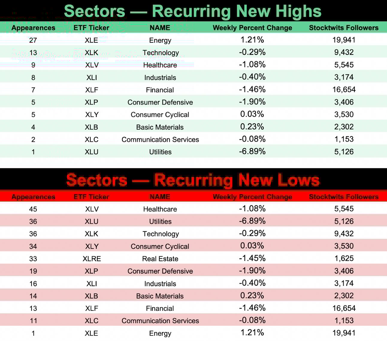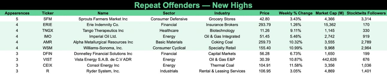 This special edition will include Friday’s New Highs and Lows as well as in depth analysis of the previous week’s tape — Repeat Offenders and Recurring Sectors + Industries. Enjoy.