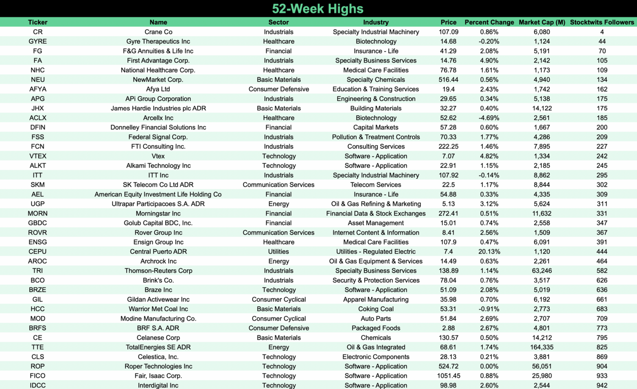 New 52-Week Highs trounced New Lows — 116 vs. 2.