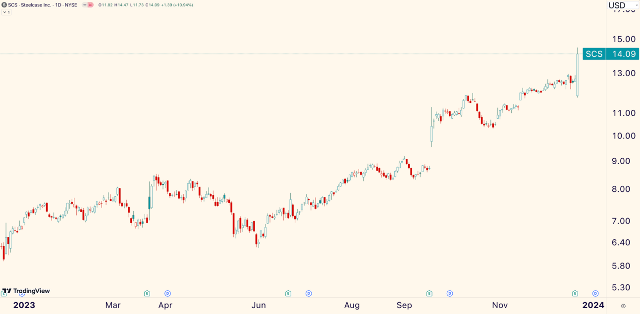 Steelcase ($SCS) is the best of the best. The office furniture manufacturer flew +10.94% following its Q3 earnings report. The company missed top-line estimates, but beat on the bottom line and raised guidance.