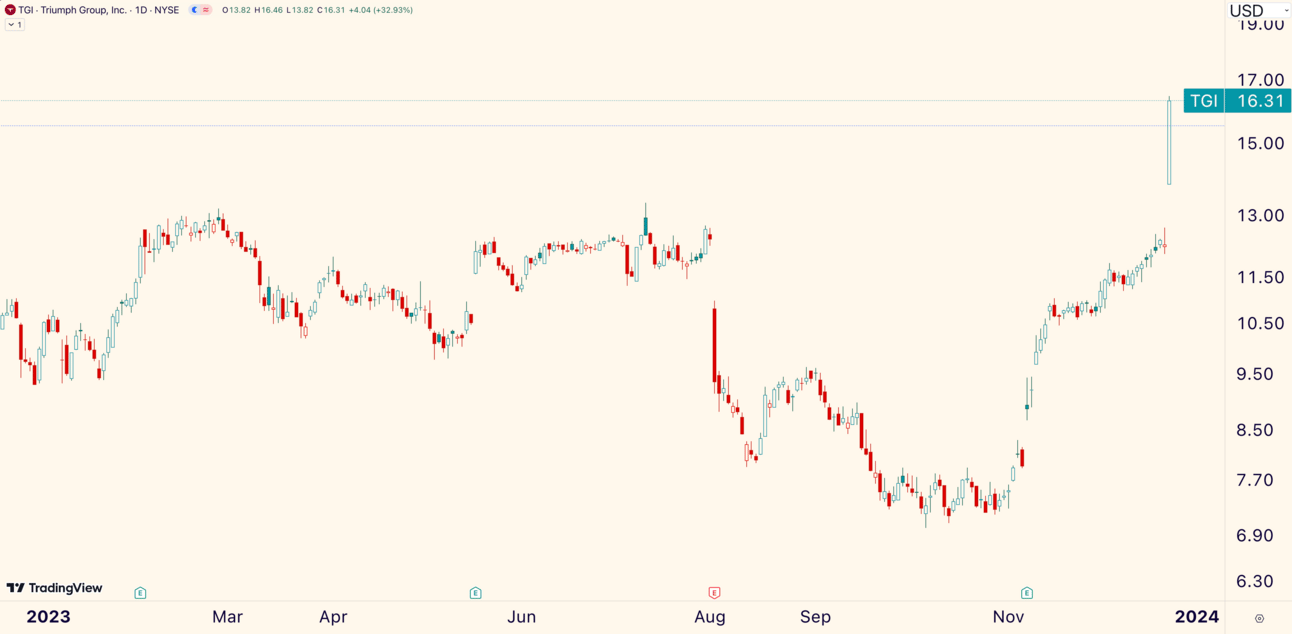 Triumph Group ($TGI) is the best of the best. The aerospace and defense company accelerated +32.93% as it announced the sale of its product support business to AAR.