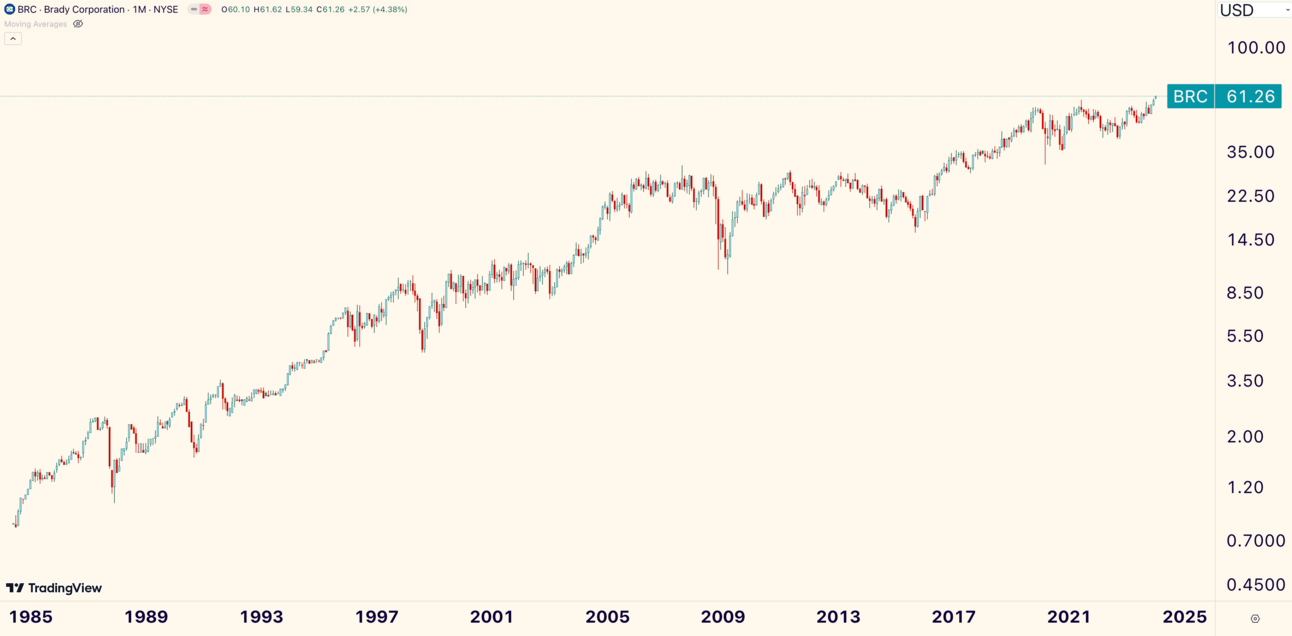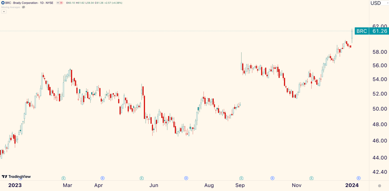 Brady Corp ($BRC) is the best of the best. The mid-cap industrial gapped and gained +4.38% to close at an all-time high.