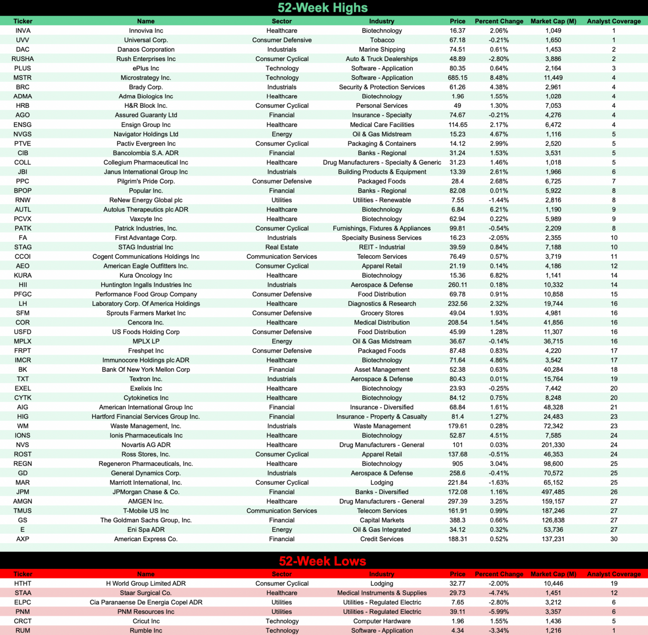 I’ve included the total number of analysts cover stocks making new 52-week highs and lows as we work to reintroduce Stocktwits followers.