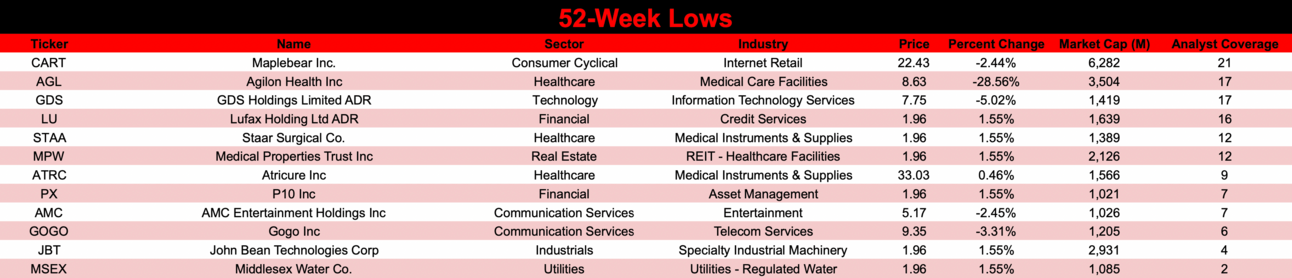 AMC Entertainment ($AMC) is the New Low Standout of the Week. The movie theater operator fell -15.52% and closed at an all-time low.