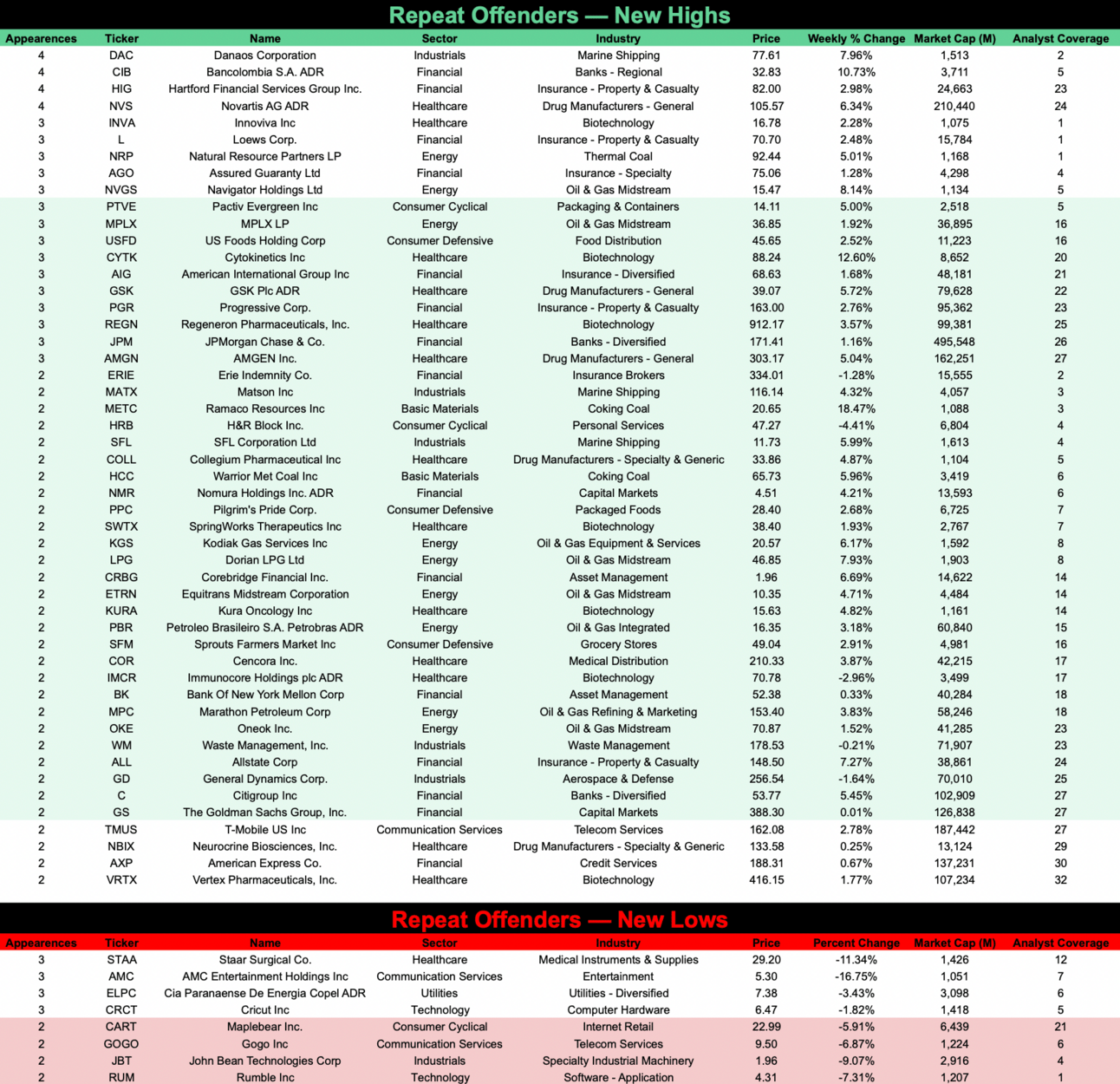 Repeat Offenders feature stocks that made new highs // lows multiple times during the previous week.