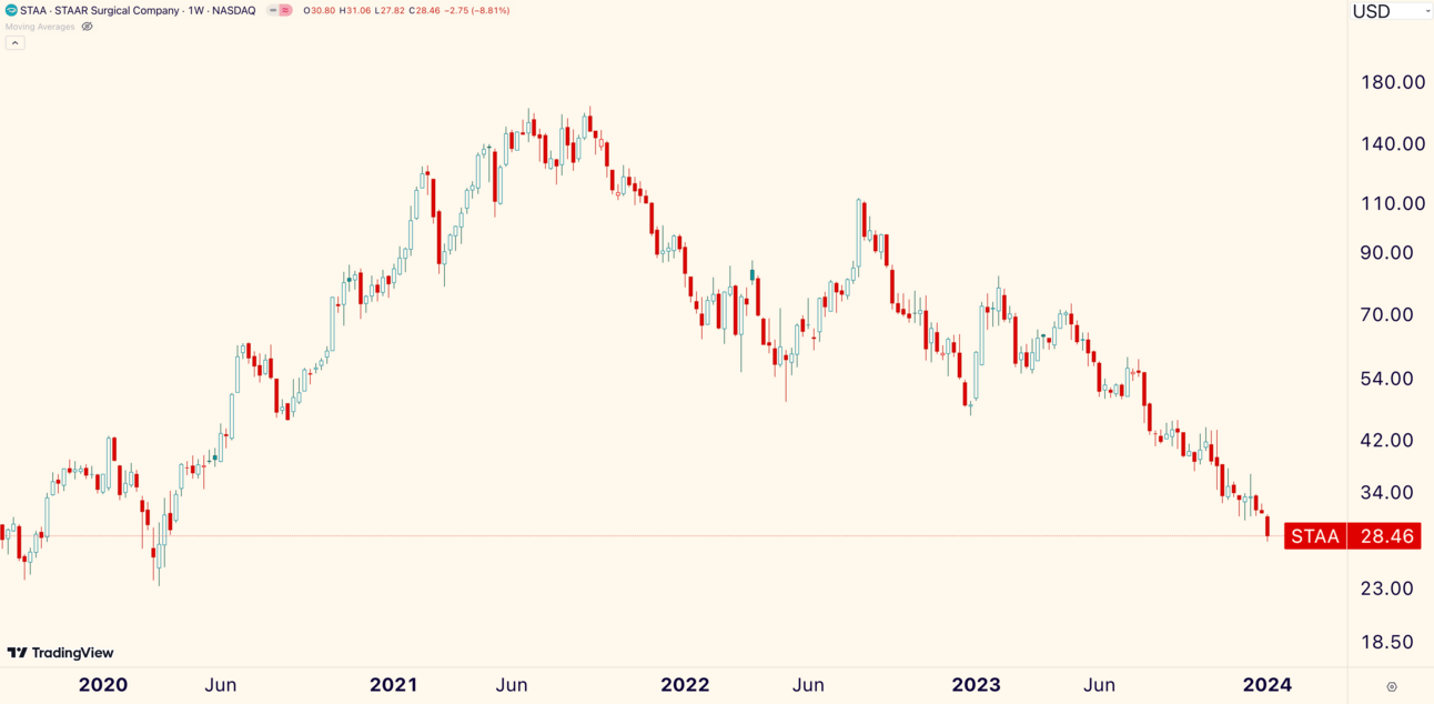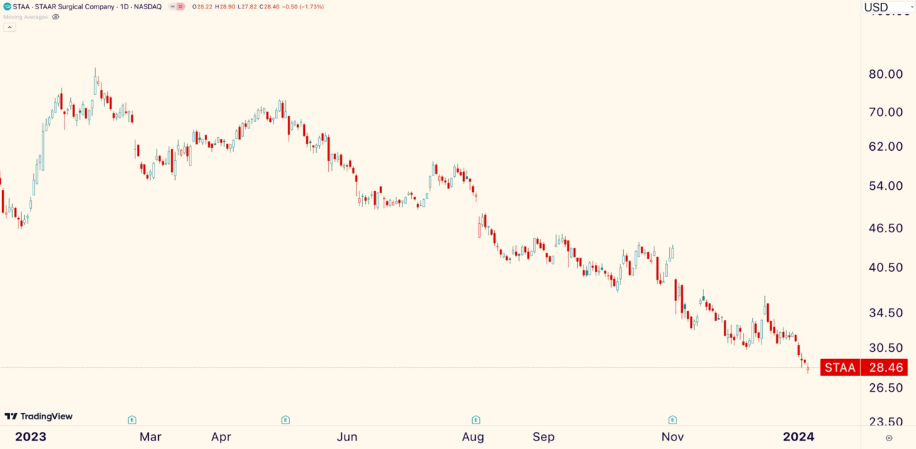 STAAR Surgical ($STAA) is a notable new low. The implantable eye-lense manufacturer lost -8.81% and closed at its lowest price since March 2020.