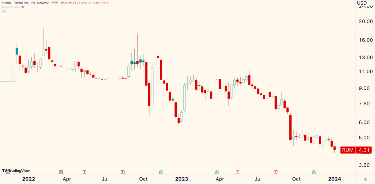 Rumble ($RUM) is a notable new low. The video platform tumbled -4.01% and closed at a weekly all-time low.