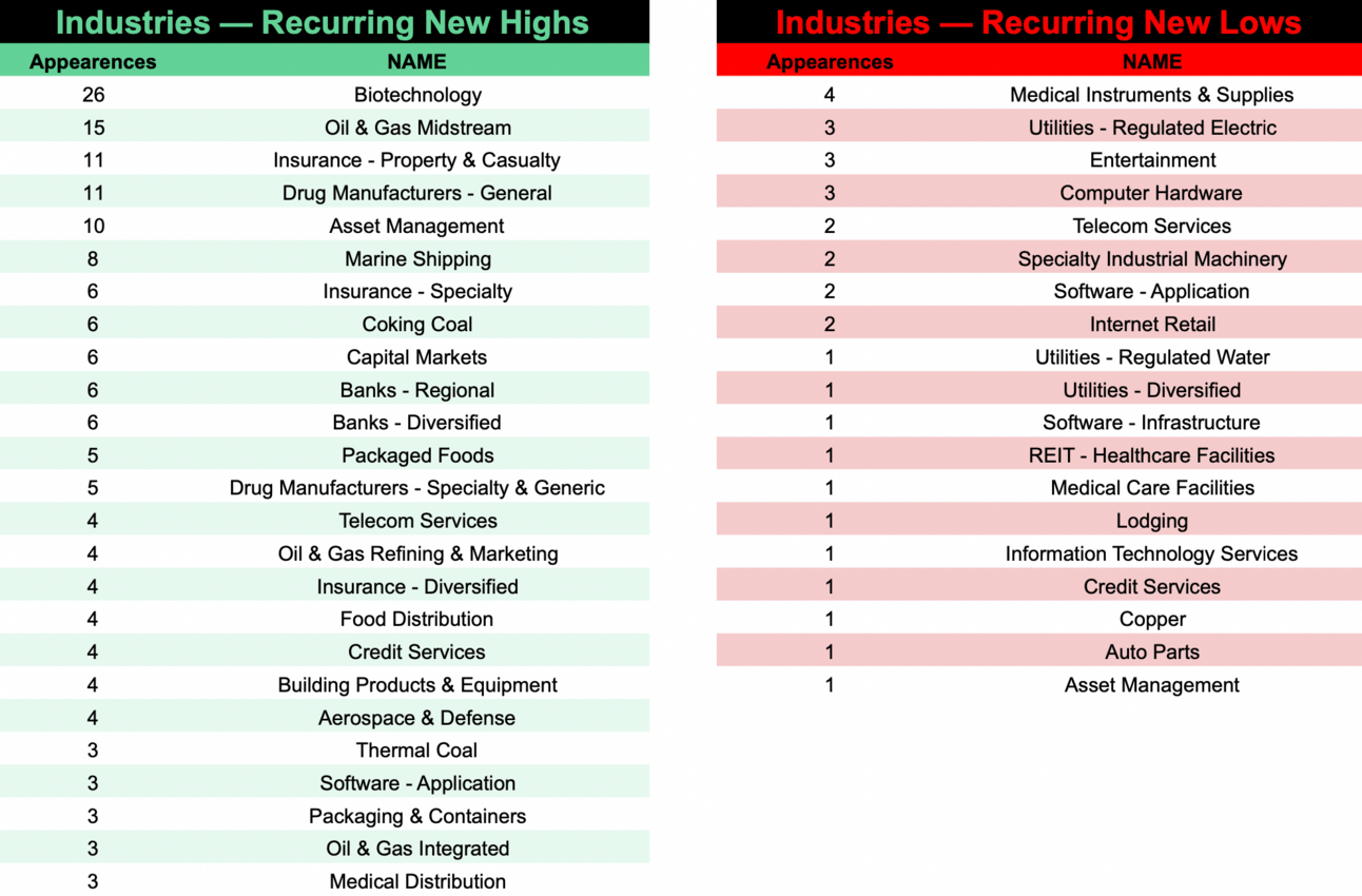 This special edition will include Friday’s New Highs and Lows as well as Repeat Offenders and Recurring Sectors + Industries.