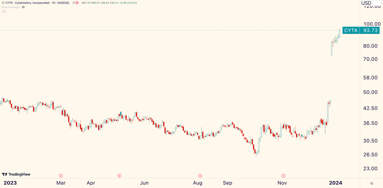 On December 27th, the company announced positive results from SEQUOIA-HCM phase 3 trial for patients with obstructive hypertrophic cardiomyopathy. The stock sailed +105% since the news.