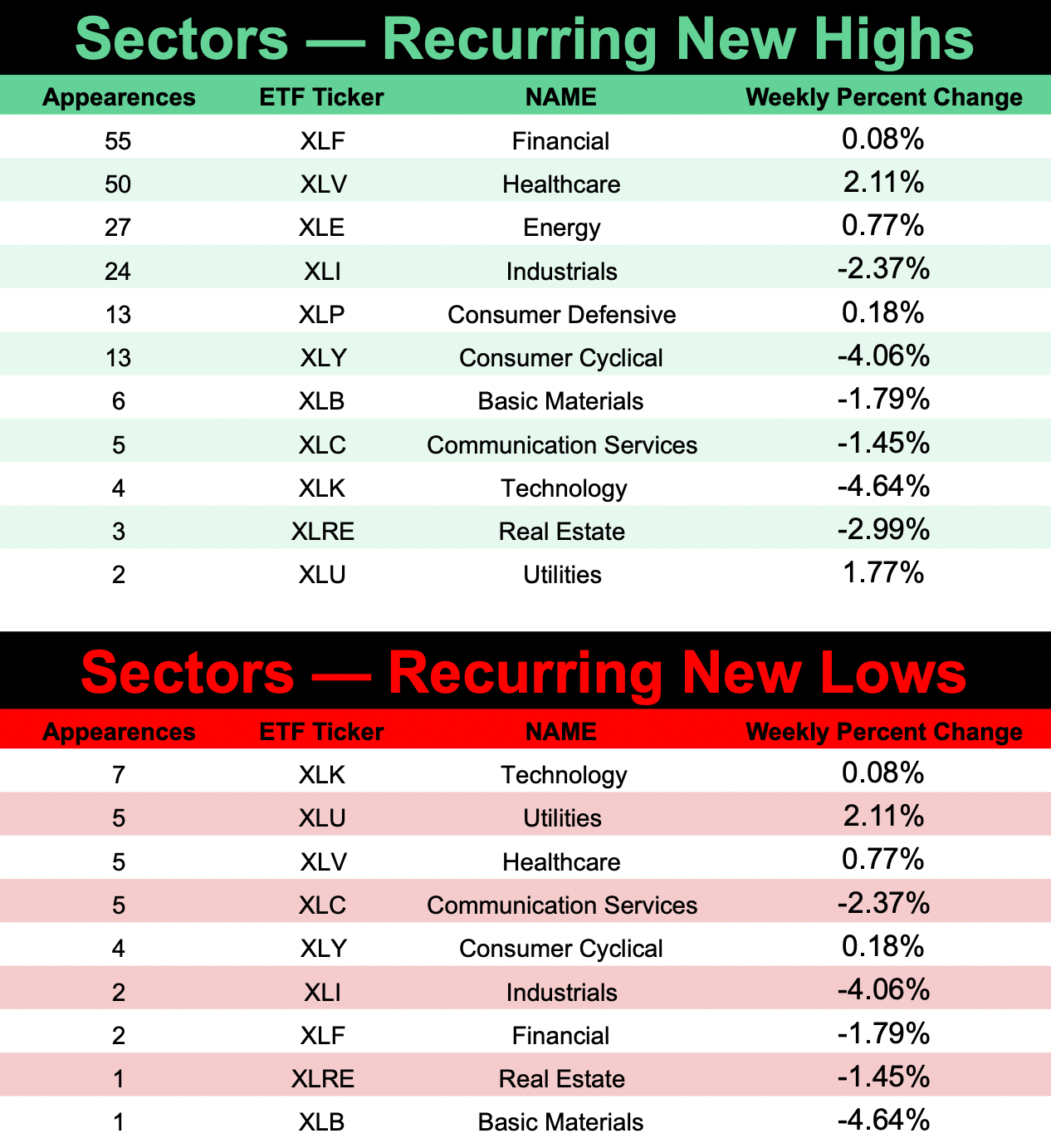 Sectors & Industries are compiled from new highs and lows throughout the previous week.