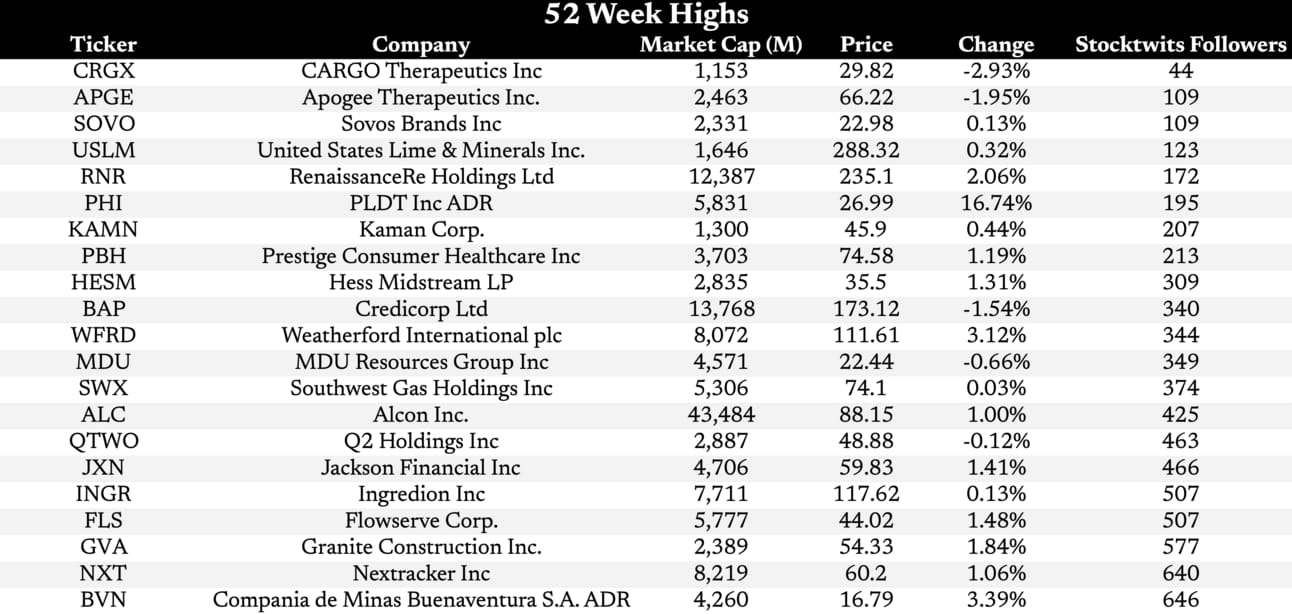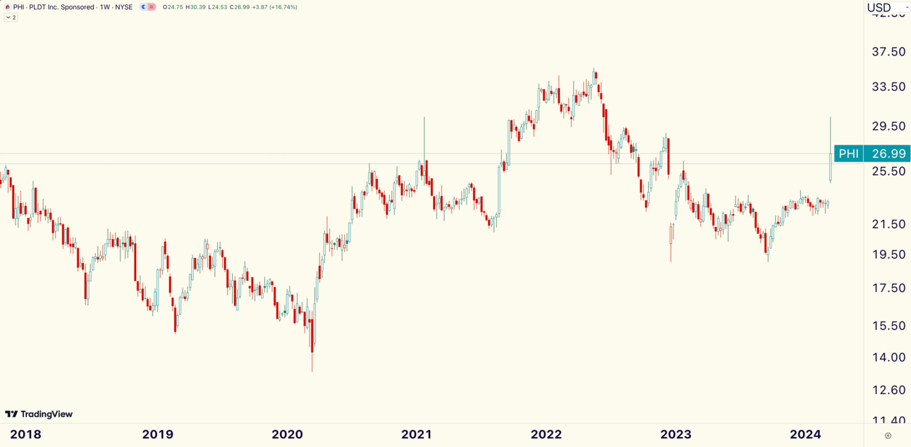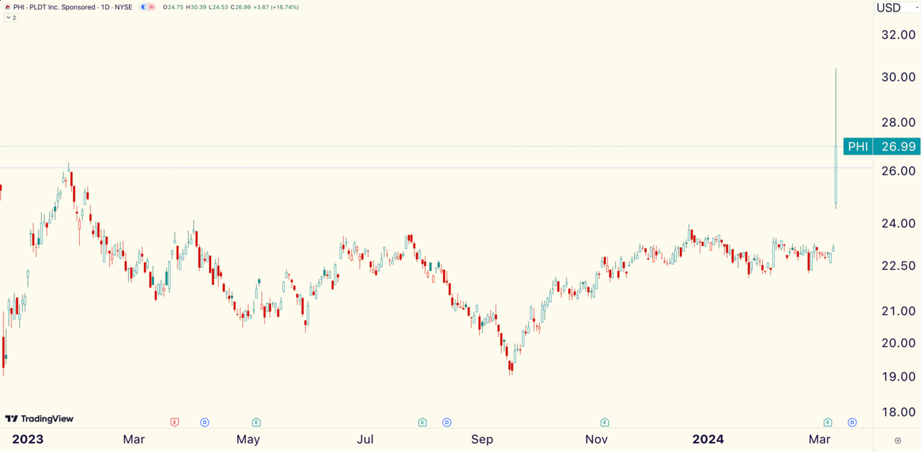 Philippine Long Distance Telephone ($PHI) is the best of the best. The Filipino telecommunications company popped +16.74% and closed at its highest price since December 13, 2023.