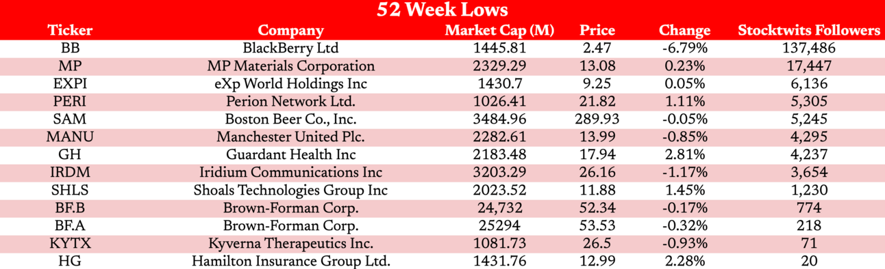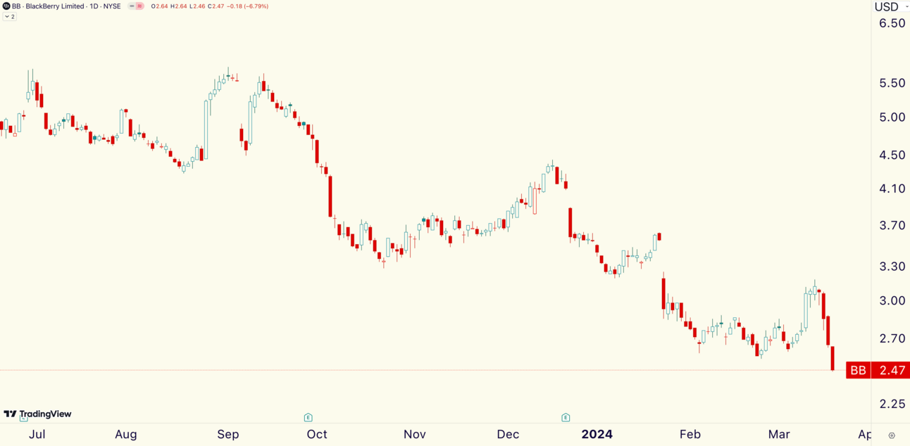 BlackBerry ($BB) is the worst of the worst. The mobile phone enterprise software company collapsed -6.79% and closed at a 21-year low.