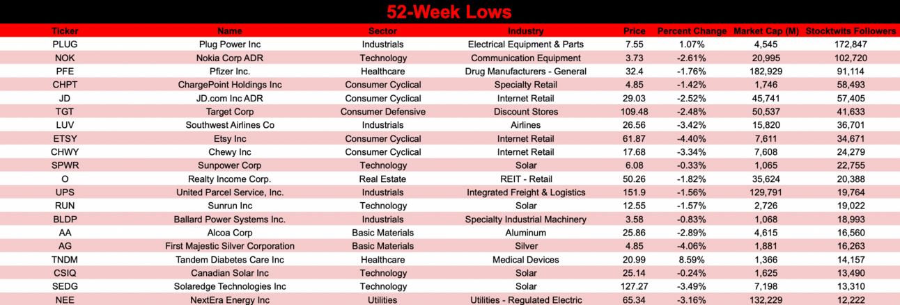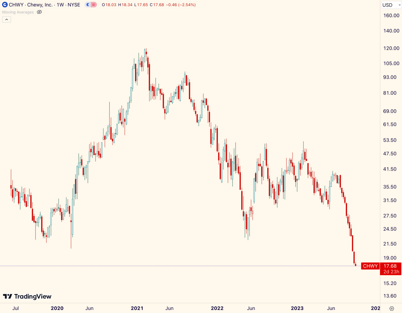 Chewy Inc. is the worst of the worst. The online pet product provider tumbled 3% as the stock seeks its 10th consecutive losing week. Here’s the weekly chart.