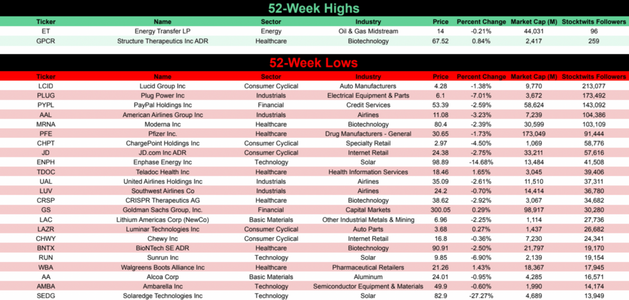 ChargePoint ($CHPT) is a notable New Low. The EV charging network tumbled -13.66% and closed at an all-time low. If the stock drops below $2.77 it will be ineligible for our lists due to a market cap below $1B.