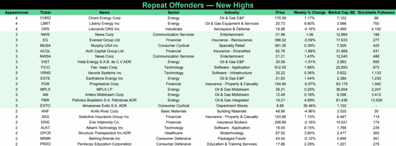 Repeat Offenders feature stocks that made new highs // lows multiple times during the previous week.